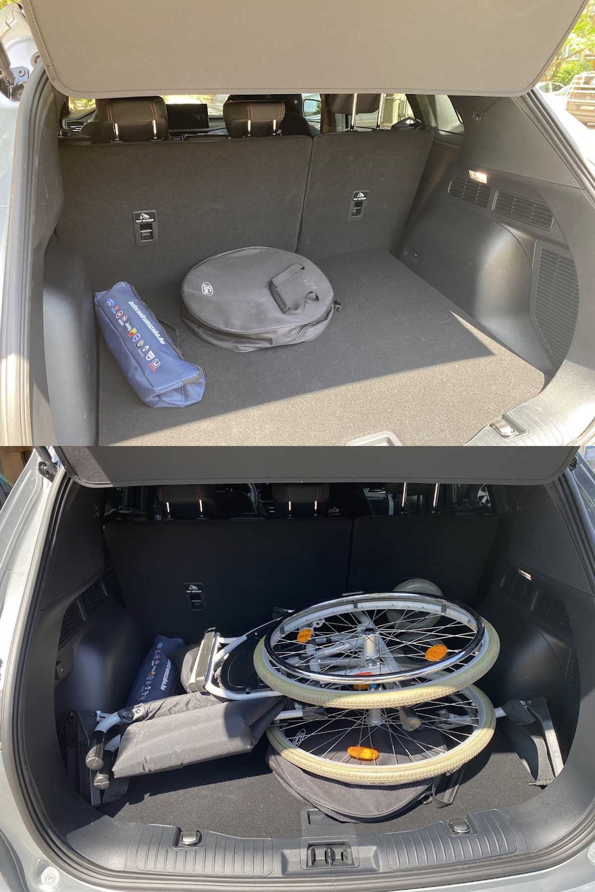 Teszteltük hagyományos, régi típusú, csak részben összecsukható kerekesszékkel is, tökéletesen elnyelte a csomagtartó úgy, hogy a hátsó ülésekhez hozzá se kellett nyúlni!